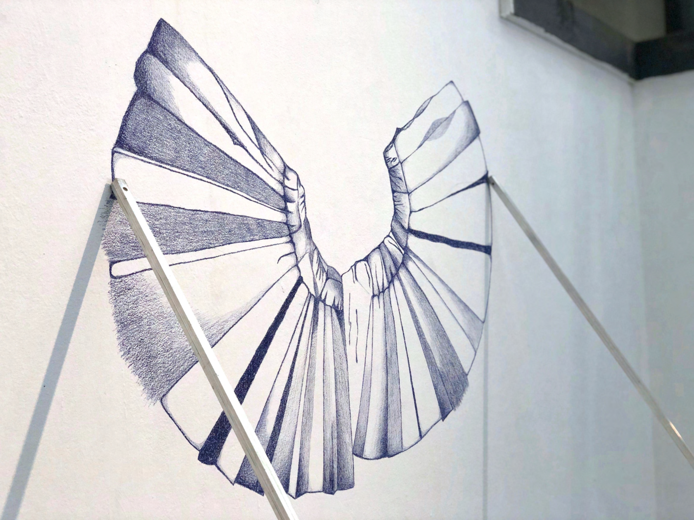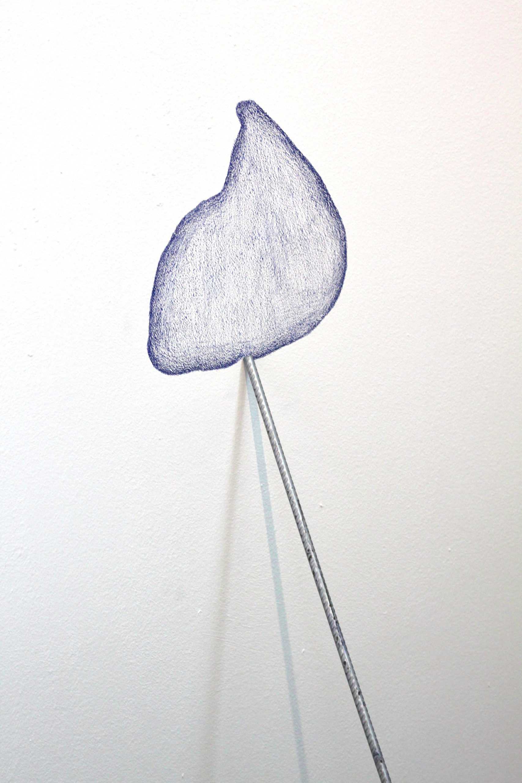 entrer un paysage là où il n’y en a pas. Les éléments découpés, peints en bleu profond et gravés de lignes blanches, évoquent des montagnes, des lignes de crête ou des routes d’eau. Sur le sol taché, les formes semblent flotter, glisser ou se déposer comme des gouttes. Les tiges dressées portent des silhouettes légères, presque effacées, qui prolongent ce paysage imaginaire vers la hauteur.