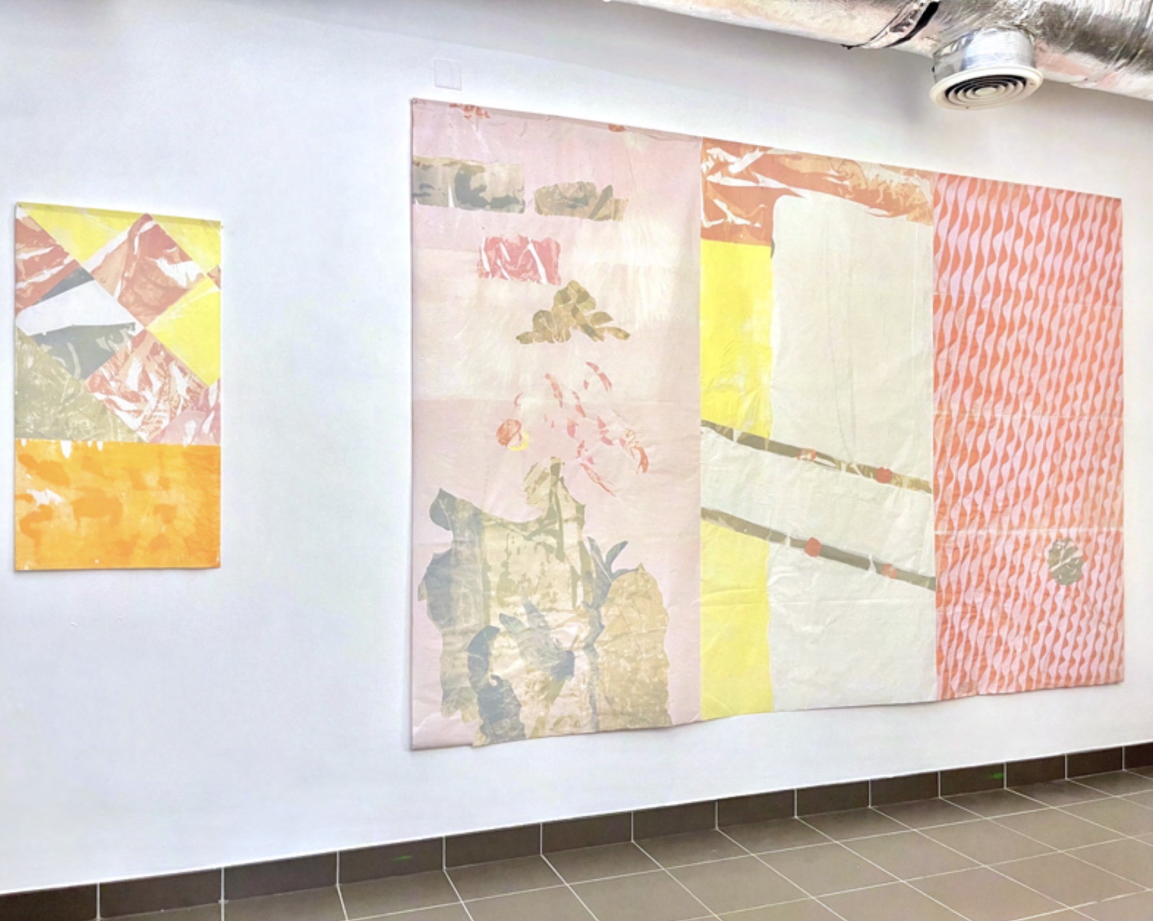 Le Port des Créateurs, Toulon, 2025, Collages de monotypes sur papiers japonais, de gauche à droite: La peau des murs n°1, 70 x 110 cm – La peau des murs n°2, 200 x 300 cm – La peau des murs n°3, 90 x 160 cm