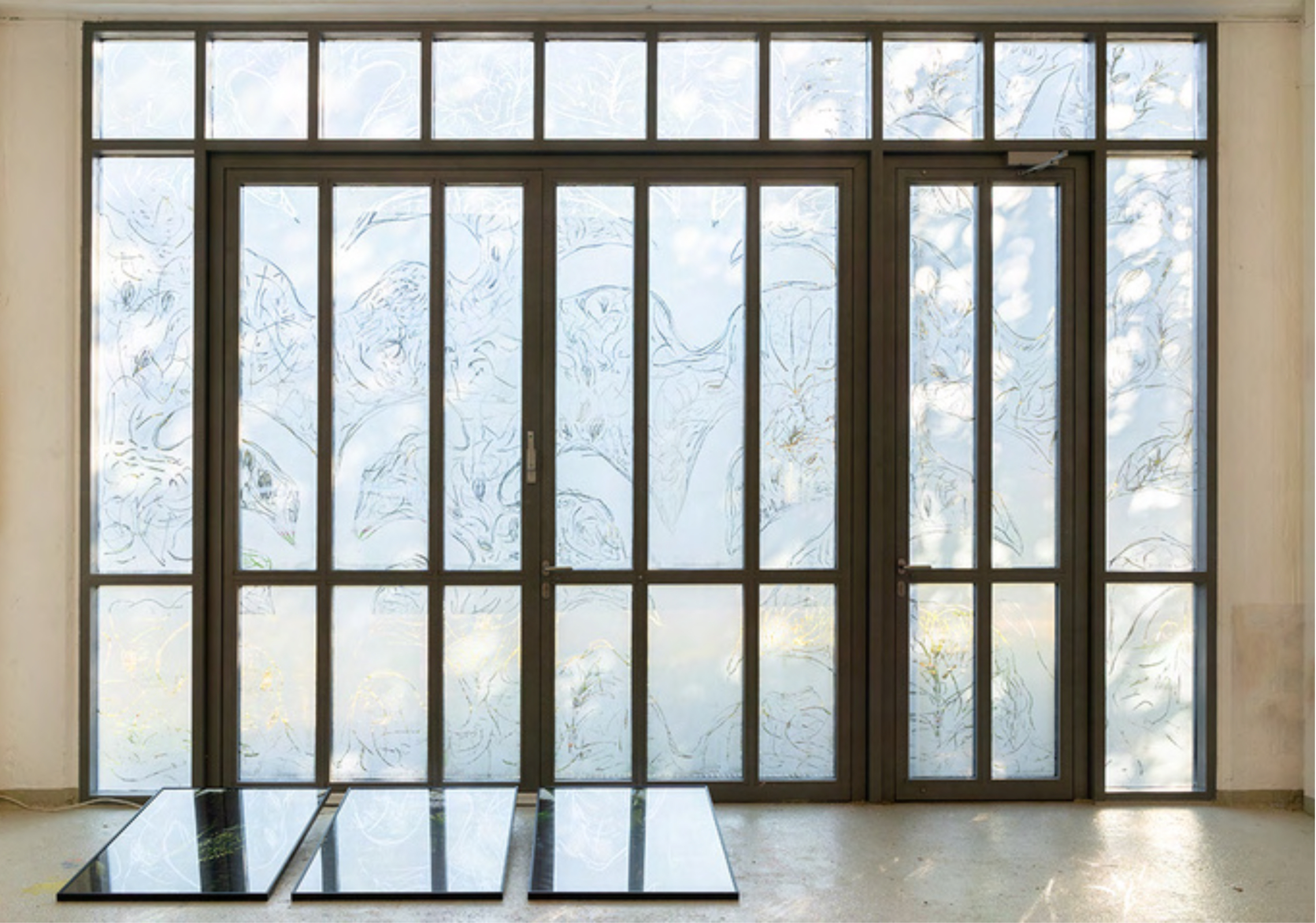surface. En effaçant cette couche, la lumière pénètre à travers le verre et vient activer le dessin. Ce sont les formes de l’extérieur, perçues depuis l’intérieur de l’espace, qui remplissent les zones gravées. L’image se construit ainsi dans un dialogue entre effacement, transparence et lumière, où le geste ouvre l’espace à ce qui le traverse.